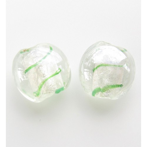Gorgeous silver foil flat round beads, white with green stripes and a lovely lustre shine.
